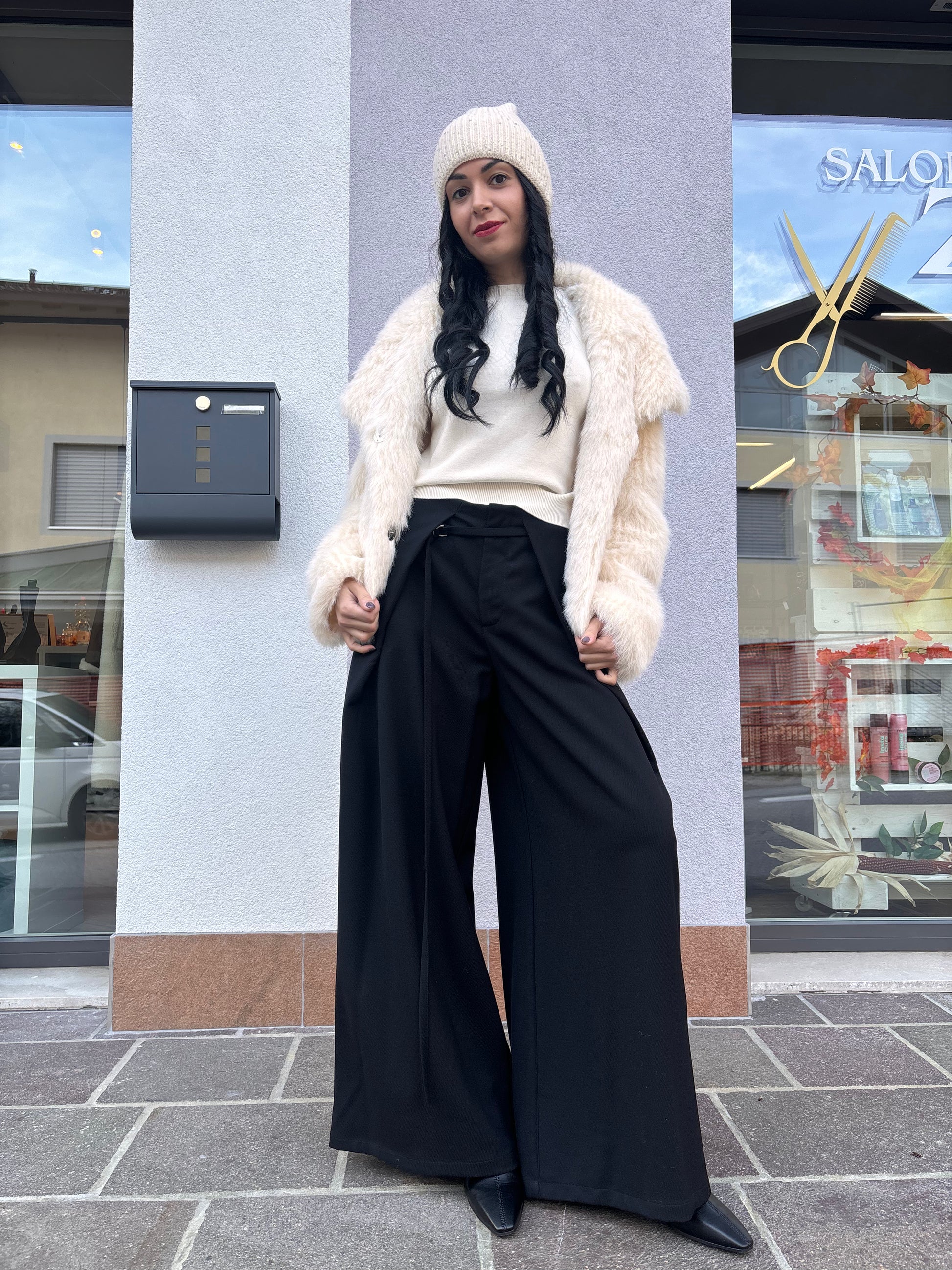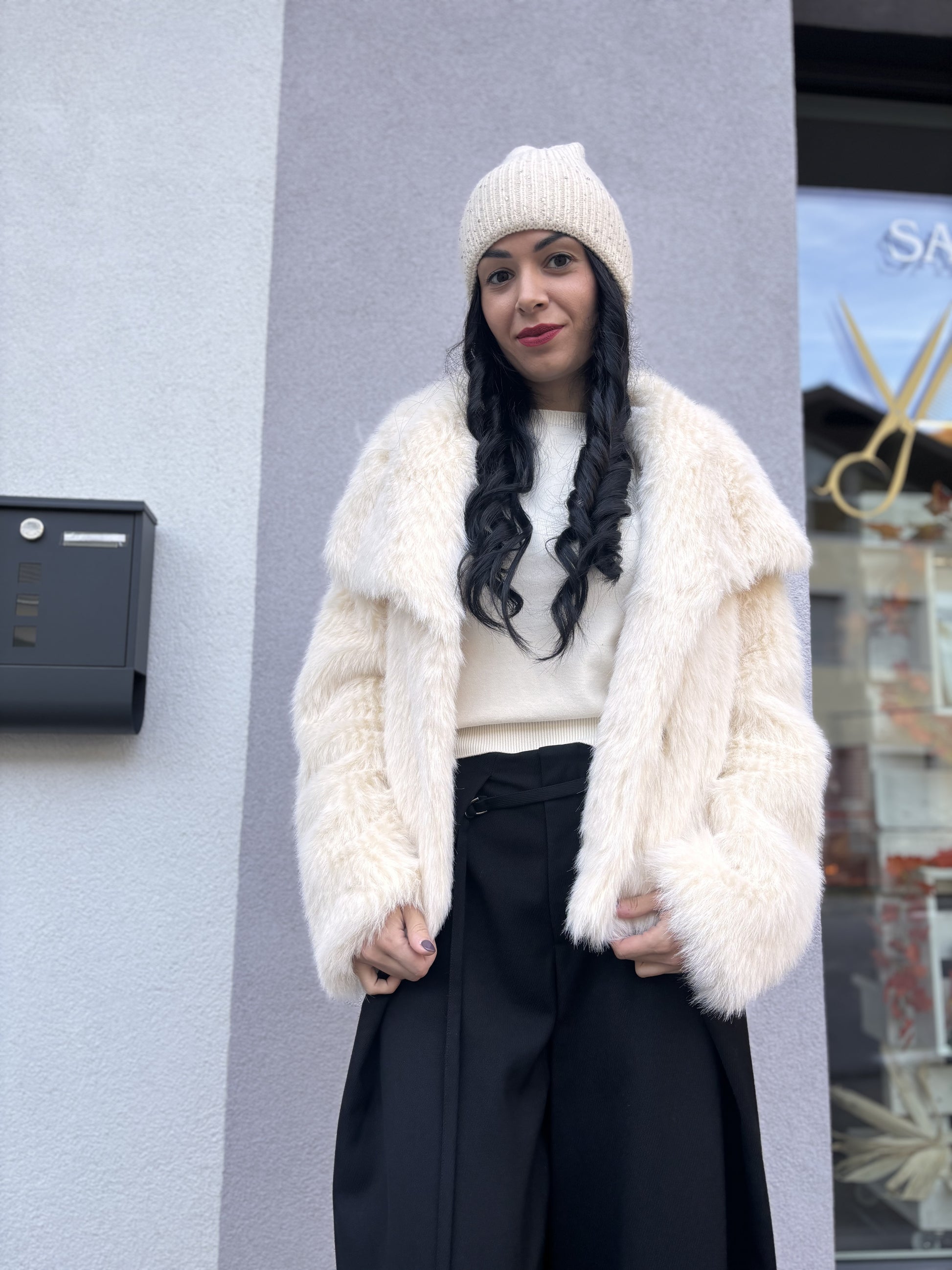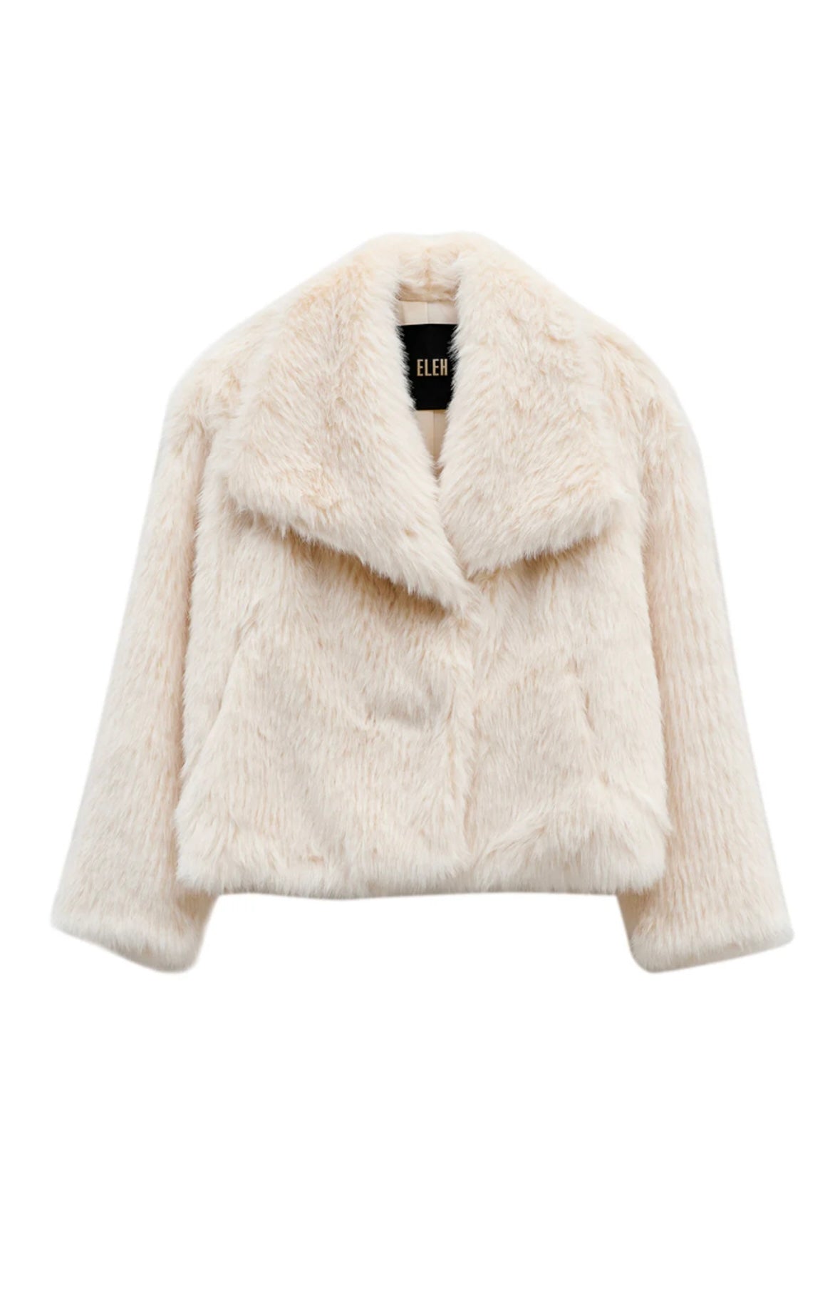 La pelliccia ecologica donna dell'etichetta ELEH si presenta nella tonalità panna arricchita da dettagli in bianco. Questo capo, pensato per chi ama vestire con stile e rispetto per l'ambiente, si distingue per la sua morbidezza e il collo sciallato.