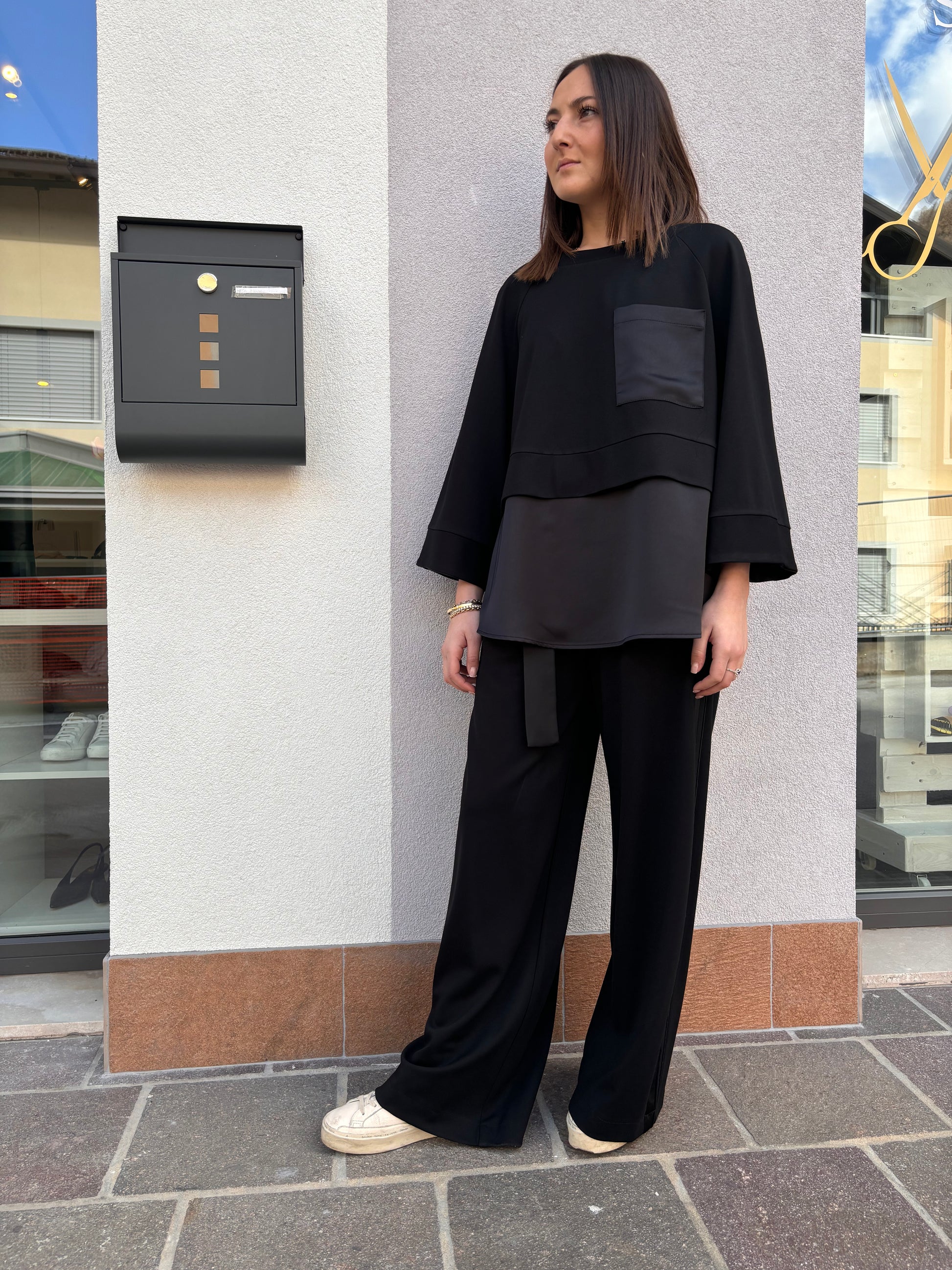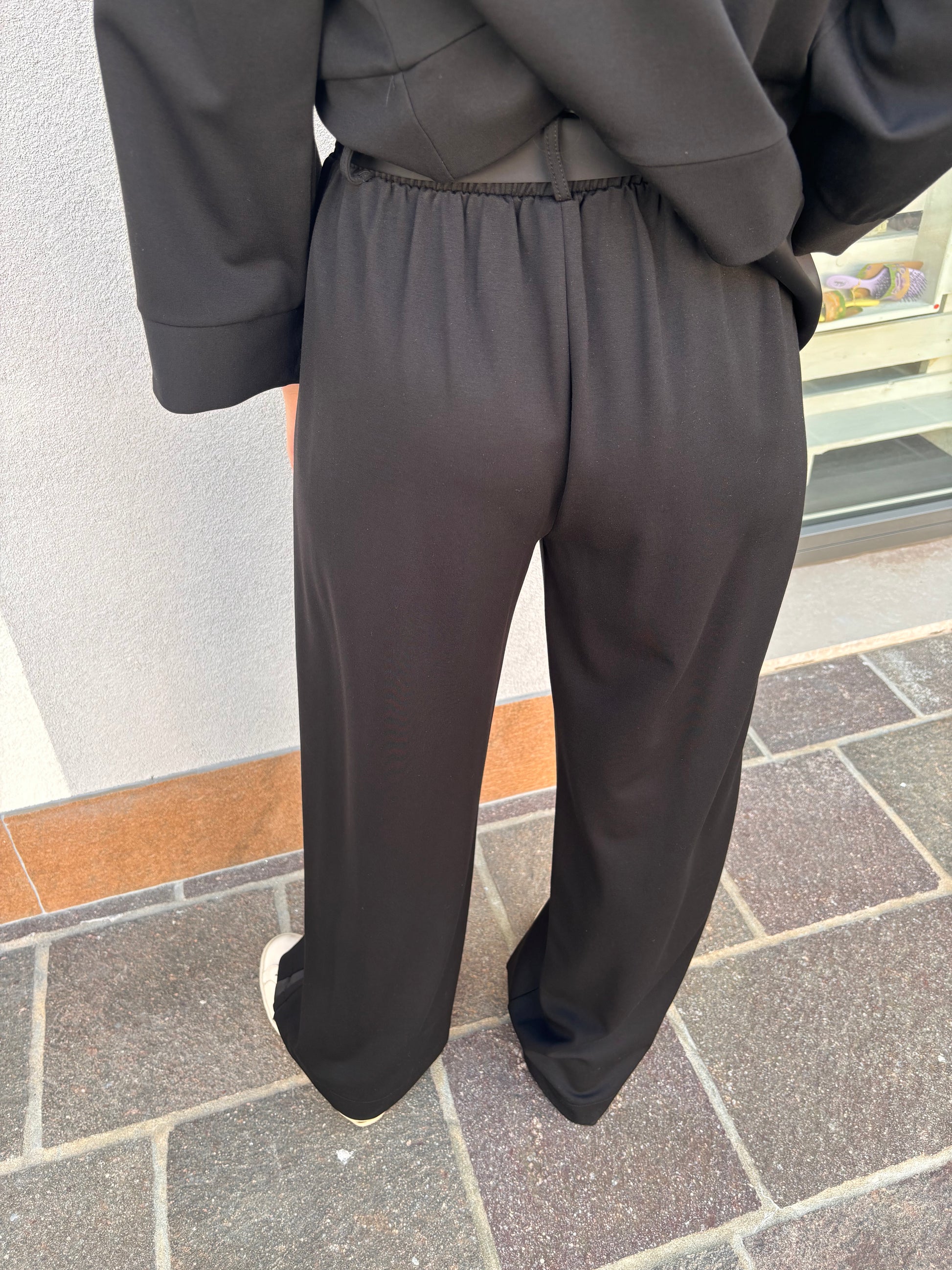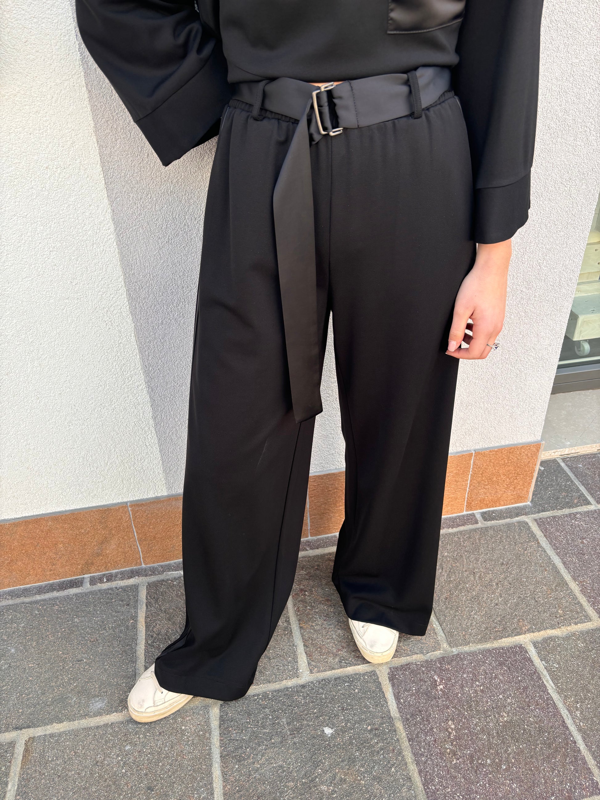 Pantalone vita alta palazzo con cintura e banda laterale in raso
